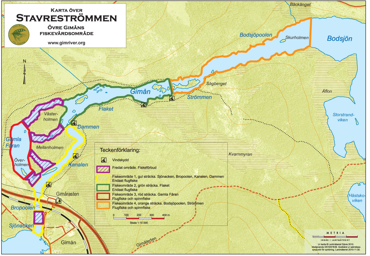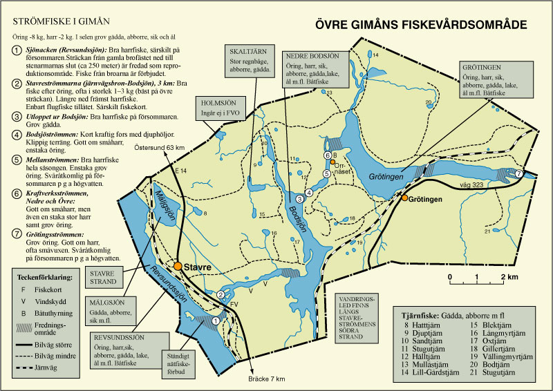 strömmen, en klassiskt flugfiskesträcka: Fiskekort kan bla. köpas vid Stavre Bua, Gimårasten, rastplatsen där väg E14 korsar Gimån. Karta över fiskevårdsområdet (2012) Hemsida: https://gimriver.se/